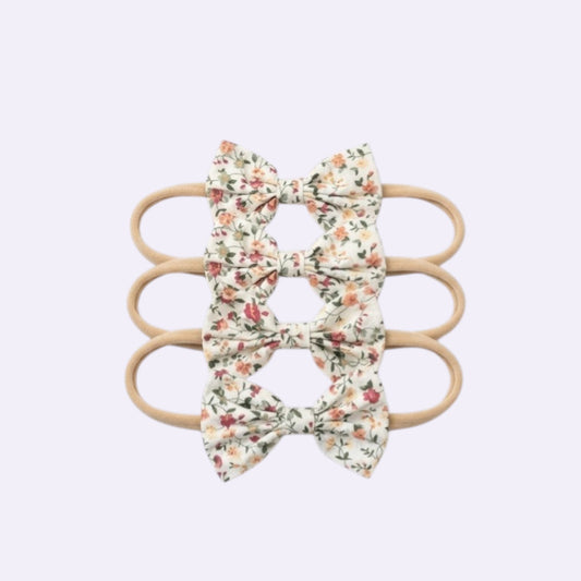 Vintage Floral Bow Baby Headband – Soft Cream Cotton Print on Stretchy Nylon Band