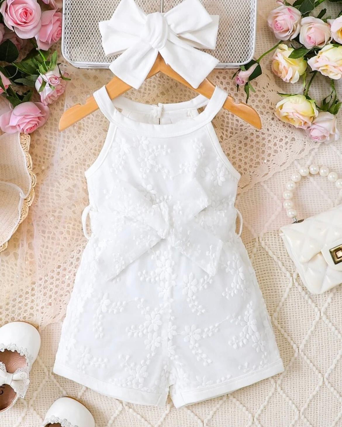 Luxuriously soft cotton blend, intricate floral embroidery, statement oversized bow, and delicate tie-back design. Designed for gentle comfort and breathability so your little one stays happy all day. Includes a matching headband for an effortlessly polished look.