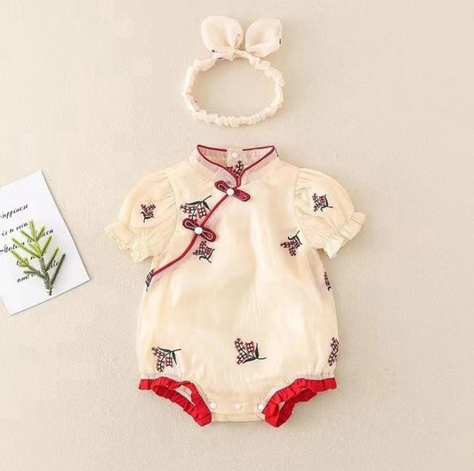 Baby Girl Oriental Style Romper with Headband – Cream & Red